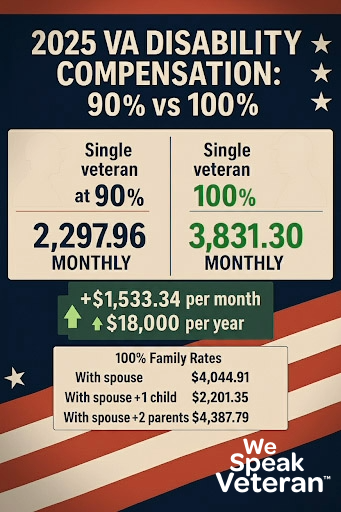 Above all, here’s what makes the jump from 90% to 100% so significant. Currently, in 2025, a single veteran at 90% receives $2,297.96 monthly. Meanwhile, at 100%? That jumps to $3,831.30 (Source: VA.gov).