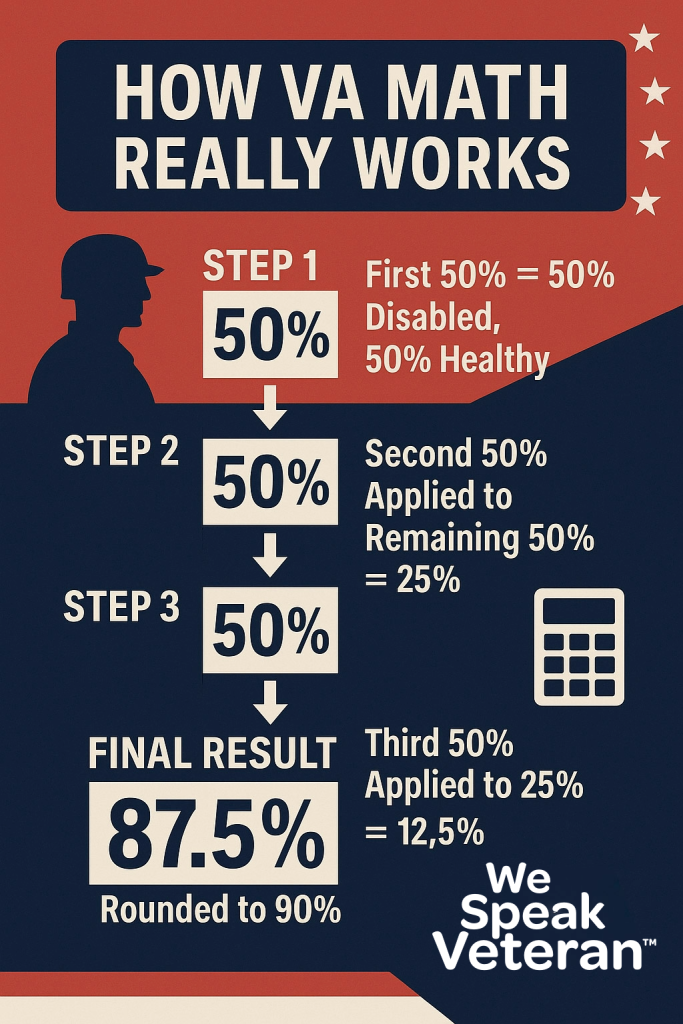 Most importantly, the biggest misconception veterans have is thinking VA math works like regular math. Unfortunately, it doesn’t. For example, three 50% ratings don’t equal 150%. Moreover, they don’t even equal 100%. Instead, they equal 90%.