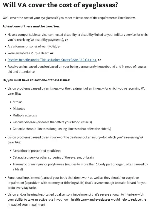 We will answer that question and also give an overview of the Veteran’s Affairs’ eyeglasses program. VA health care benefits may help pay for some or all of your vision care costs. You may be eligible for free eyeglasses from the VA if you meet any of the requirements. Stay tuned to learn more!
